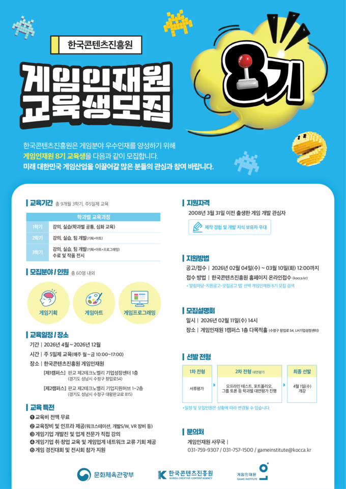 문화체육관광부(장관 최휘영)와 한국콘텐츠진흥원(원장직무대행 유현석, 이하 콘진원)은 실무형 게임개발 전문가 양성을 위한 ‘게임인재원 8기 교육생’ 모집을 시작한다.
