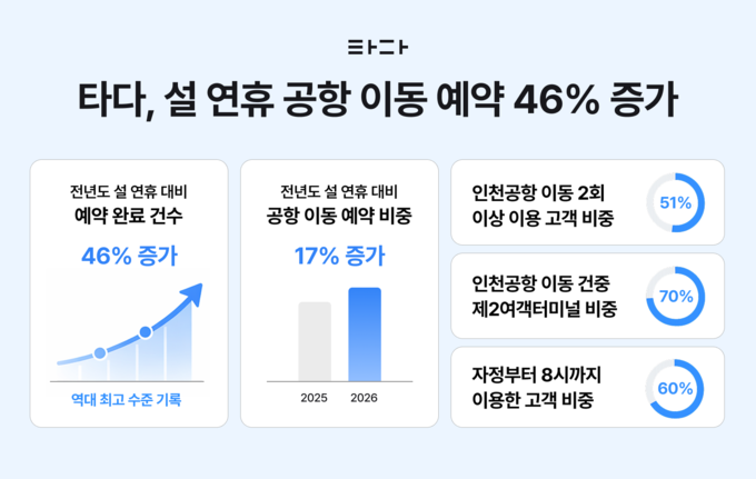 모빌리티 플랫폼 타다(운영사 브이씨엔씨, 대표 강희수)가 2026년 설 연휴 기간 공항 이동 예약 완료 건수가 전년 동기 대비 46% 증가하며 역대 최고 수준을 기록했다고 27일 밝혔다. ‘100% 예약 확정’ 시스템을 통해 여행객의 이동 불확실성을 해소한 점이 주요 성장 요인으로 분석된다.