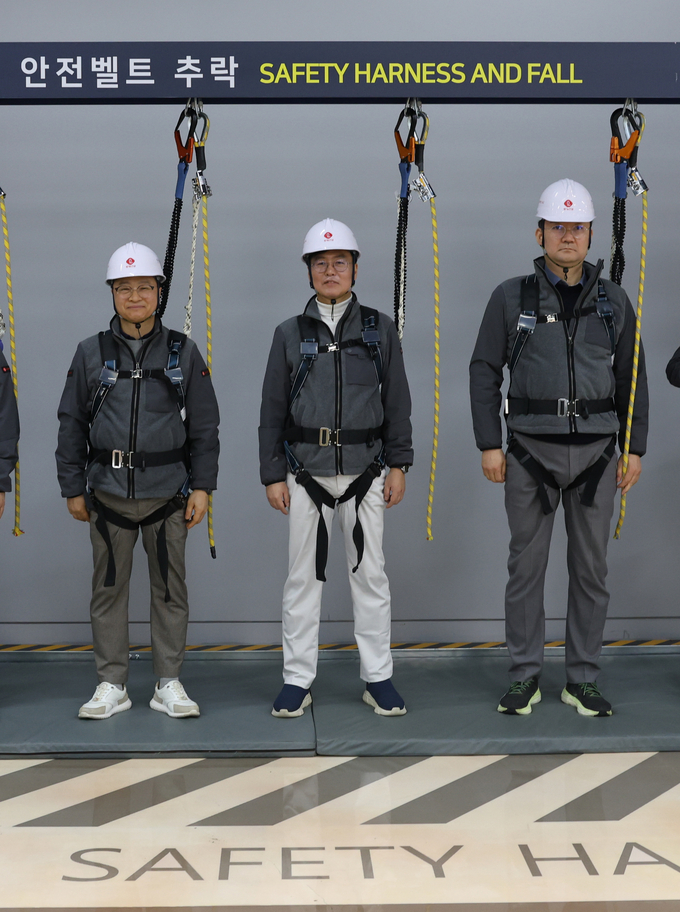 오일근 롯데건설 대표를 비롯한 38명의 경영진이 27일 경기도 오산시 롯데인재개발원 내 안전체험센터 ‘Safety ON’에서 안전체험교육에 참여했다.