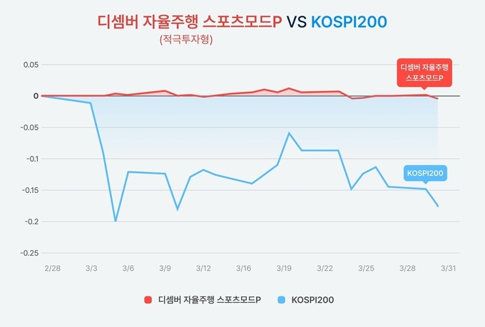 이러한 방어력은 개별 알고리즘의 성과로도 직결된다. 중동 전쟁 발발 1개월을 맞이한 지난 3월 31일 기준, 최근 1개월 동안의 코스피 200이 -17.34%의 높은 하락률과 극심한 변동성을 보여준 것과 대조적으로, 동기간 디셈버 자율주행 스포츠모드P(적극투자형)은 -0.39%의 수익률로 하락장 속에서도 안정적인 운용을 지속하는 것을 확인시켰다.