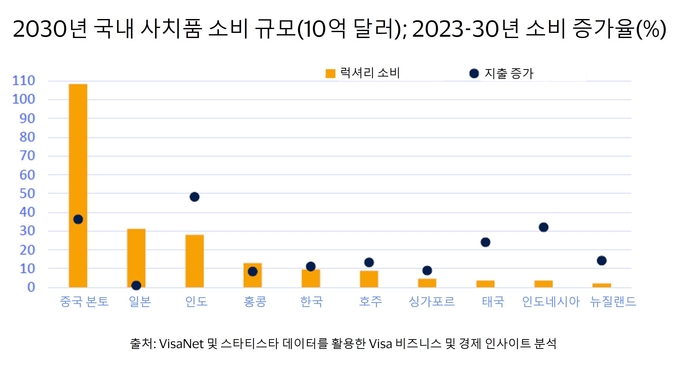비자의 분석에 따르면, 2030년에는 중국과 일본이 아태지역 전체 럭셔리 소비의 약 65%를 차지하며 시장을 주도할 전망이다. 중국은 1,080억 달러(약 145조 6,000억 원) 규모로 아시아 최대 럭셔리 시장을 형성하고, 일본은 310억 달러(약 41조 8,000억 원) 규모로 2위를 차지할 것으로 예상된다. 한국은 100억 달러(약 13조 5,000억 원) 규모로, 인도(280억 달러)와 홍콩(130억 달러)에 이어서 아시아 5대 럭셔리 시장에 진입할 것으로 분석됐다.