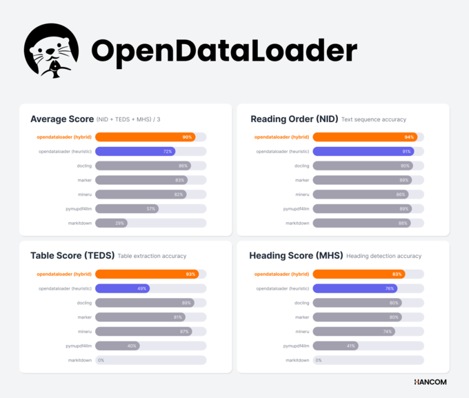 한글과컴퓨터(이하 한컴)가 오픈소스 PDF 데이터 추출 부문에서 벤치마크 1위 성능을 달성한 ‘오픈데이터로더(OpenDataLoader) PDF v2.0’을 12일 공개했다.